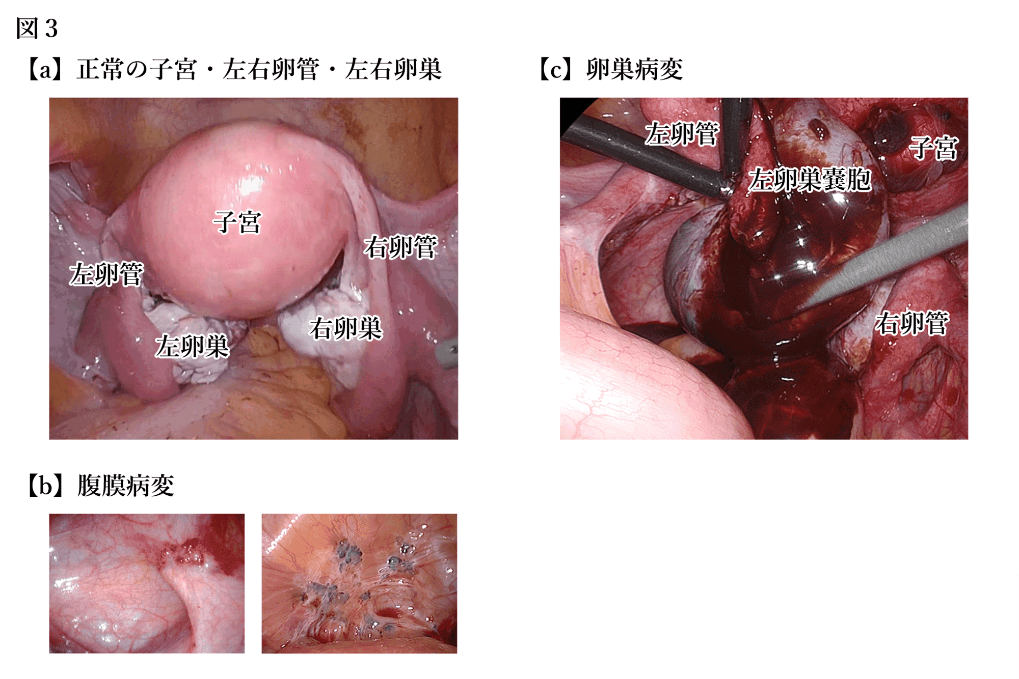エンドメトリオーシスは身体のあらゆる場所に発生しますが、とくに起こりやすいのは子宮の周辺の腹膜表面です(図3【b】)。同時に多発し、進行して広がり、まわりの組織と癒着を起こすのが特徴です。また、卵巣にできた場合は、病巣の中に組織を含んだ血液がたまり、嚢胞(卵巣チョコレート嚢胞)をつくります(図3【c】)。また、稀ではありますが、肺、膀胱、直腸、臍、手術創などに発生することがあります。