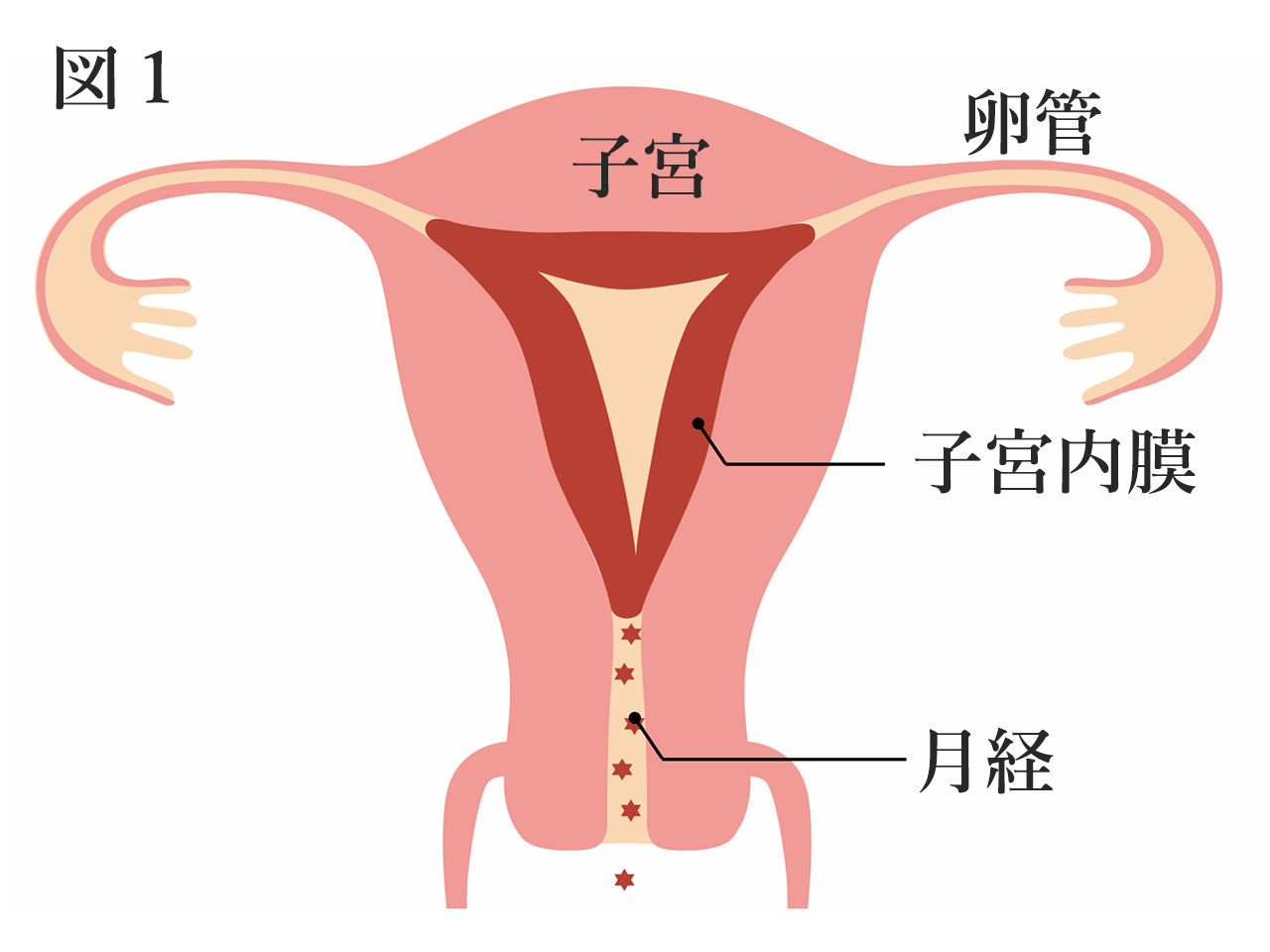 月経とは、毎月、妊娠の準備のために発達する「子宮内膜」という子宮の内側をおおっている組織が(図1)、妊娠しなかった場合に剥がれおちてきたものです。