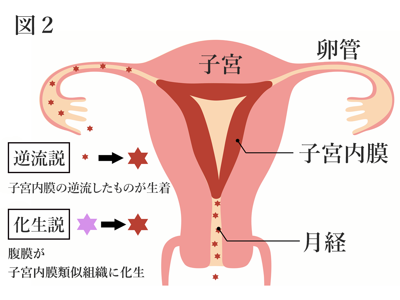 エンドメトリオーシスでは、この「子宮内膜」に似たような組織が、子宮の外にできてしまって、月経と同じような変化を起こす病態です。